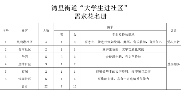 (2)社区基层服务工作人员要求:甘于奉献、能吃苦耐劳,工作细致,认真负责;部分岗位要求有文字功底,有新媒体工作经验、有较强组织沟通能力的优先;身体健康、无重大疾病,能适应在暑期工作;听从管理、服从工作安排。