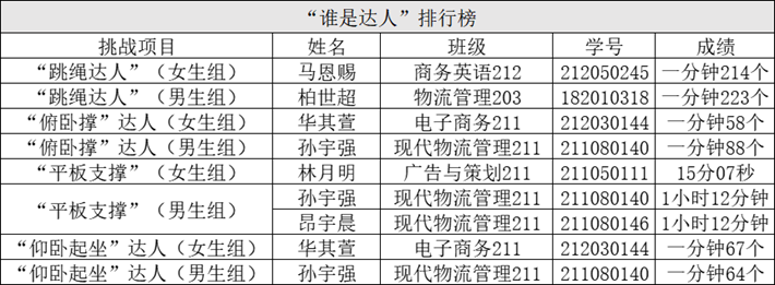 活动在住校老师的支持和关心下有序开展,老师们也积极参与锻炼,用实际行动作出表率,在老师们的带动下,活动得到广大同学的广泛关注和踊跃参与,活动现场气氛如火如荼,精彩不断,跳绳 雷火竞技app下载,平板支撑,仰卧起坐,每个同学都能在自己感兴趣的项目上尽情展示,不亦乐乎,更高,更快,更强,更团结的体育精神感染了现场所有同学,运动达人们骄人的成绩更是赢得了现场同学的阵阵掌声与喝彩,经过激烈角逐,商务英语212班马恩赐,物流管理203班柏世超等9名同学获得运动达人称号,展现了商贸学子勇于挑战,拼搏进取的精神面貌。