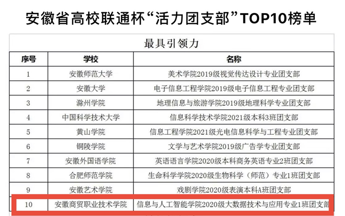近日,2022年安徽省高校“活力团支部”TOP10榜名单公布 雷火竞技,我校大数据技术与应用专业201班团支部入选“活力团支部”最具引领力TOP10榜。
