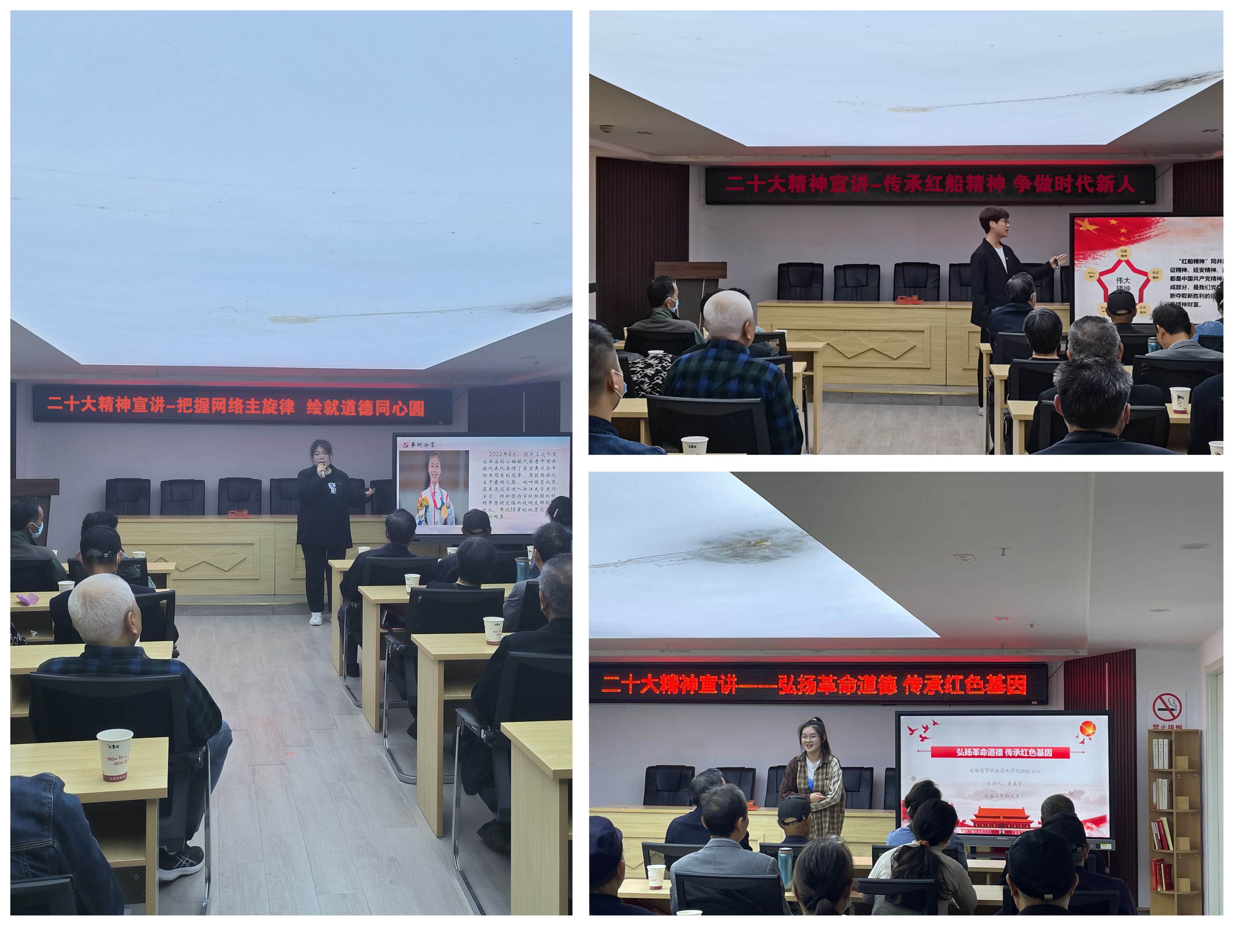 在北门口社区多功能厅,三位同学分别以传承“红船精神”,弘扬中国革命道德,把握网络主旋律为主题,与社区的老党员进行了分享交流,他们从小的切入点着手,以00后学生视角 雷火竞技app下载,结合实际生活学习,畅谈了作为新时代大学生如何积极学习宣传贯彻党的二十大精神,分享交流赢得了社区党员和居民的热烈掌声,大家对我校学生的理论素养和综合素质纷纷点赞。