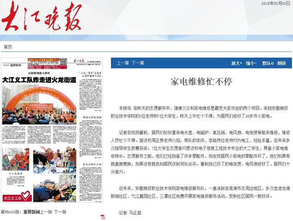活动刚一开始,电信系的师生们便都忙的不亦乐乎,活动现场气氛高涨,尽管天气有点寒冷 雷火竞技app下载,但参加志愿服务活动的师生们依旧挥洒着笑容,倾注着努力,热心接待每一位居民,用扎实的专业技能和实际行动体现了电信系师生积极的精神面貌和强烈的社会责任感,活动现场,一位拿着修好的电风扇的居民说:“今年夏天我家再也不用买新风扇了,你们维修的是电器,维系的是民心,我为你们点个赞”,此次活动得到了芜湖《大江晚报》,“今日芜湖”等主流媒体的关注和报道。