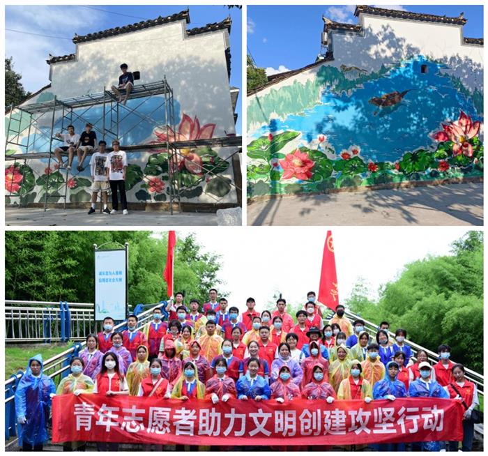 在投身疫情防控志愿服务的同时,学院另一批学子还发挥专业特长,积极投身家乡“创建文明城市 争做文明市民”文明城市,文明乡村的创建工作,成为志愿服务的“多面手”,动漫设计211班洪怡欣同学就是一位出色的“多面手”,洪怡欣同学假期回到家乡休宁县海阳镇后,一方面积极参加万宁社区龙升街道核酸检测志愿服务活动和社区日常防疫巡检工作,一方面积极响应安徽省“大黄山”宣传推广活动,发挥专业特长,带领返乡的其他大学生们积极投入“共建美丽乡村志愿者”活动,承接了新塘村的墙绘工作,在家乡的青砖黛瓦间绘制一幅幅“接天莲叶无穷碧,映日荷花别样红”的图案,为家乡增添一道明亮的色彩,在高河镇怀宁县人民医院十字路口,数字媒体技术211班的何文丽同学顶着炎炎的酷暑参与交通劝导员工作,引导大家有序通行,协助老人穿越马路,成了该路口一道靓丽的风景线,虽然晒黑了,但路人都由衷地称赞“这姑娘美 雷火竞技官网,”数字媒体技术201班张之杰同学回到家乡后,积极响应宁国团市委的号召,在团市委的组织下,和其他志愿者一起参加各项文明创建攻坚活动,其积极主动,任劳任怨的工作态度获得大家的一致称赞。