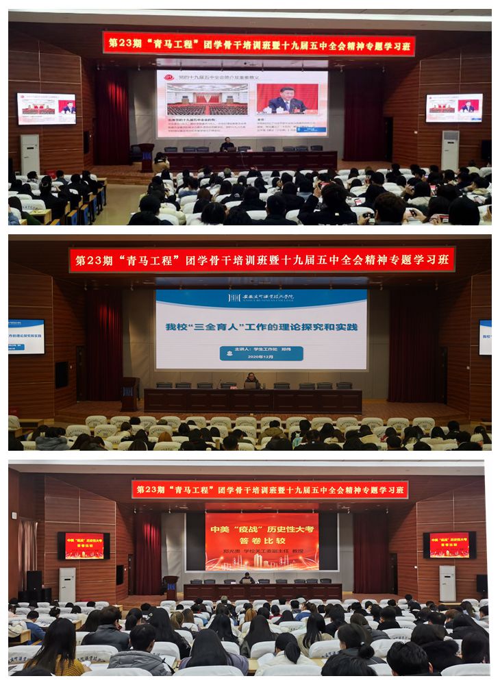 学校党委书记章顺来作《十九届五中全会精神解读》专题讲座,介绍了十三五以来在决胜全面建成小康社会取得的决定性成就,分析了我国发展环境面临的深刻复杂的变化,指明了未来五年的发展目标和到2035年要实现的远景目标,并希望同学们认真领会十九届五中全会精神增强四个意识,坚定四个自信,做到两个维护,将个人梦融入中国梦,将小我融入大我,将理想信念转化为实际行动,为实现中华民族伟大复兴的中国梦而奋斗,校党委委员,雷火竞技ios版处处长郑伟作《学校三全育人工作思考与实践》专题讲座,深入解读了学校三全育人方案,要求广大团学干部在当好受教育者身份的同时,还要做好引领者和参与者,用自身的实际行动为学校的三全育人工作发挥应有的作用 雷火竞技安卓版,校关工委副主任郑光贵作题为《中美“疫战”历史性答卷:中美社会制度和文化优劣比较》专题讲座,阐述中国和西方国家面对同样的一场疫情,在防控举措方面所形成鲜明对照,深度解析了我国在疫情防控中展现的中国力量,中国速度,中国担当,进一步彰显了党领导下的中国制度优势。