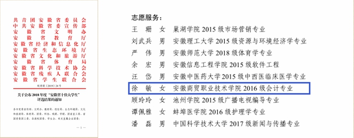日前,共青团安徽省委,省委宣传部,省文明办,省教育厅等11家单位联合印发了《关于公布2018年度“安徽省十佳大学生”评选结果的通知》,我校会计系会计161班徐敏同学荣获“安徽省优秀大学生”荣誉称号,同时,在省委教育工委组织的2018年度安徽省大学生年度人物评选工作中,徐敏获得“2018年度安徽省大学生年度人物提名奖”称号 雷火竞技,这是我校学子首次同时获得两项殊荣。