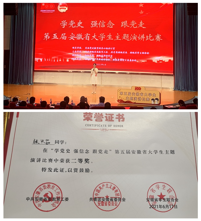 日前,由省委党史教育领导小组办公室指导,团省委,省委教育工委,省学联联合主办的“学党史 强信念 跟党走”第五届安徽省大学生主题演讲比赛决赛在合肥学院举行,我校荣获二等奖1项,优秀指导教师2人 雷火竞技,并获优秀组织奖, 。