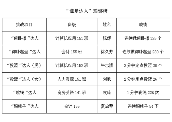 经过前期预热,活动得到全院同学的广泛关注及踊跃参与,活动现场人头攒动,加油声,欢呼声此起彼伏,选手们不断追求更快,更强的体育精神感染了现场所有同学,运动达人们骄人的成绩更是让现场小伙伴们都惊呆了,经过激烈角逐,计算机应用151班陈辉,会计155班徐久芳等6名同学获得运动达人称号 雷火竞技官网。