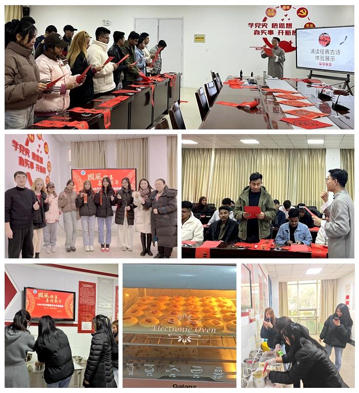现场留学生们在路贺龙,许美珏两位老师的指导下,学习书法知识,学写春联龙“福”,感受书法魅力,收获属于自己的定制版春联 雷火竞技手机版,跟随路贺龙老师的指导,共同品鉴诵读古诗《元日》,在朗朗读书声中感受新春气象,留学生们在周园园和许明星老师的讲解中了解春节传统和民俗文化,气氛热烈,王倩倩,汪小芳老师带领留学生一起动手烘焙新年糕点,师生一同备材料,制面糊,做装饰,体验动手实践的过程,品尝手工制作的糕点,品味劳动的美好滋味。