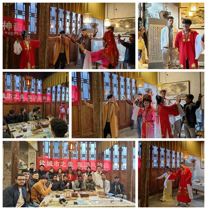 为了立足群体和地域特点,设计了城市文化主题美劳活动,学院副院长王松林和相关教师带领留学生走进芜湖古城知我茶社,品茶道,学茶礼,留学生们在茶艺师的指导下了解中国茶文化的历史,以及品茶,冲泡,茶具品鉴等茶知识,留学生们尝试沏茶,闻茶,品茶,体会茶文化的精妙之处,走台步,唱念白,留学生们身着戏曲服装,跟随戏曲演员学习黄梅戏和越剧的身形,步法,汲取了戏曲知识 雷火竞技ios版,零距离体验中国戏曲的魅力,留学生们激动地说“春节是中国最重要的节日,学戏,品茶,写书法,对我来说都是全新的体验,”。