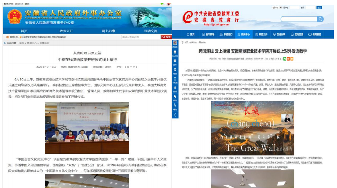 传播中国语言。“汉语国际推广”作为国家战略发展框架的一部分,关乎国家的软实力和国际竞争力,也是“一带一路”建设发展的基础。为此,我校2019年在泰国曼谷和大城依托合作院校分别建立了1个中国语言文化交流中心,每年派遣优秀教师赴泰进行为期一年的汉语教学。2020年受疫情影响,汉语教学改在线上进行,当年完成教学468学时,参与学生达到550余人。此次线上汉语教学也同样受到了省教育工委、省市外办的新闻报道和好评。
