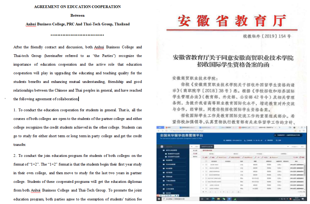 引生,为贯彻落实教育厅关于做好来皖留学工作的指示精神,我校积极创造条件,将扩大留学生入学规模作为学校国际化发展的重要目标,2019年,我校获得留学生教育资格备案,2020年开始招收留学生,目前已录取来自摩洛哥等6国的近20名一年制非学历留学生,学校积极推广“中文+商科”教育,提升对“一带一路”国家学生的吸引力,即将与泰国大城商务技术管理学院和泰国塔克西纳商务技术管理学院签订“1+2”学历联合培养协议,中泰学生在彼此学校学习1年后,可赴对方学校学习2年获得双方的毕业证书 雷火竞技ios版,双方互免学生后两年的学费和住宿费。