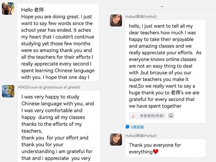 在2021“基础汉语”秋季班结业班会中,任课教师们为即将结业的同学们一一送上祝福,留学生代表韩飒表示,这一年来老师们的辛勤教导与悉心照顾让她记忆犹深,最后她用一句“我爱你们”来表达对学校和老师们的感念之情,据悉,学校后续会将结业证书,成绩单等材料邮寄到学生所在国家 雷火竞技官网,为他们在商贸的这段特殊学习经历画上圆满句号。