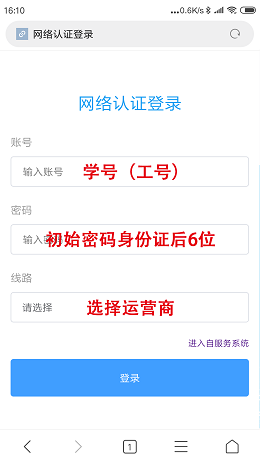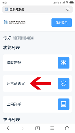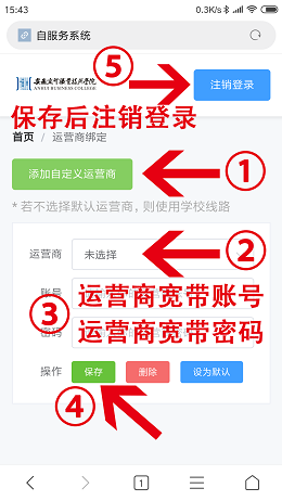 (进入自服务系统 > 运营商绑定> 添加运营商> 选择运营商并输入账号密码> 保存> 注销登录 > 进入网关系统登录);
