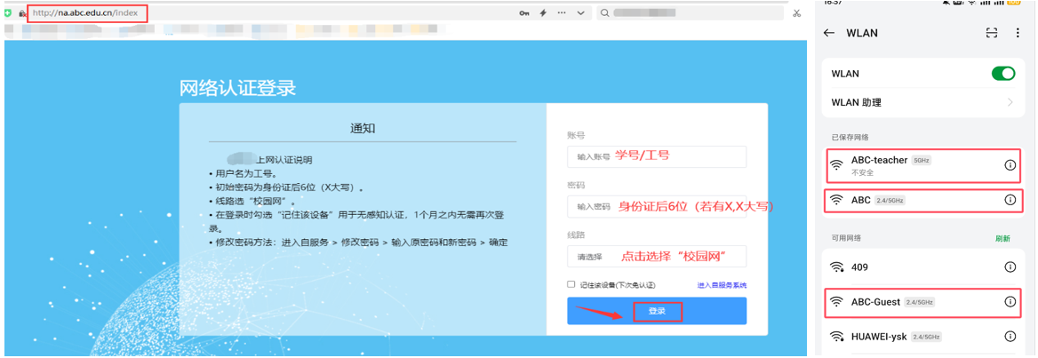 操作方法:打开浏览器,在地址栏中输入:na.abc.edu.cn或IP地址:172.17.1.30后回车,即可打开认证页面。