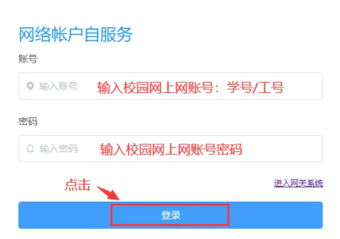 在“网络账户自服务”中 雷火竞技官网,输入个人的校园网上网账号及密码,选择登录。