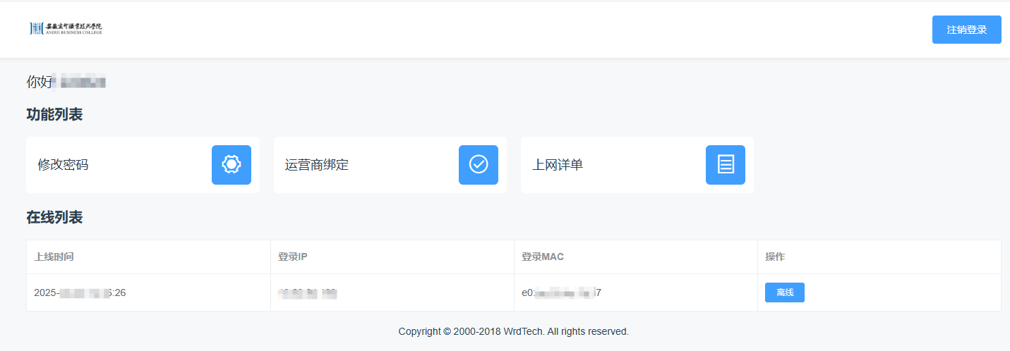 在使用校园网的过程中 雷火竞技,学校提供校园网自服务系统,师生进入系统可以进行密码修改,运营商绑定,查看上网详单和管理已登录终端等操作。