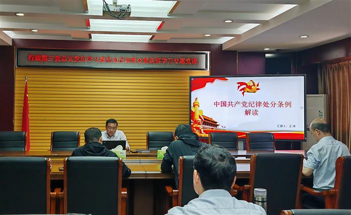 为了深入推进学习贯彻习近平新时代中国特色社会主义思想主题教育,营造“以学正风”的政治生态 雷火竞技app下载,党委副书记王炜在弘商楼第二会议室为行政第三党总支全体党员上党纪学习教育专题党课,讲座由行政第三党总支书记孙握瑜主持。