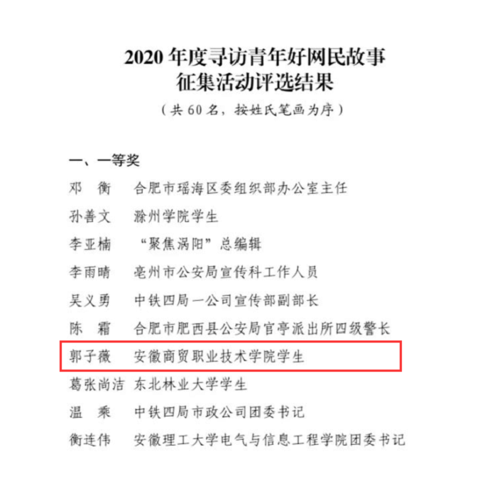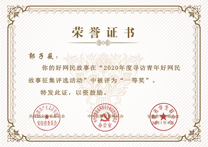 近日 雷火竞技,由共青团安徽省委,安徽省网信办,安徽省学生联合会联合开展的“2020年度寻访安徽青年好网民”故事征集评选活动结果揭晓,我校2020届学生郭子薇荣获一等奖。