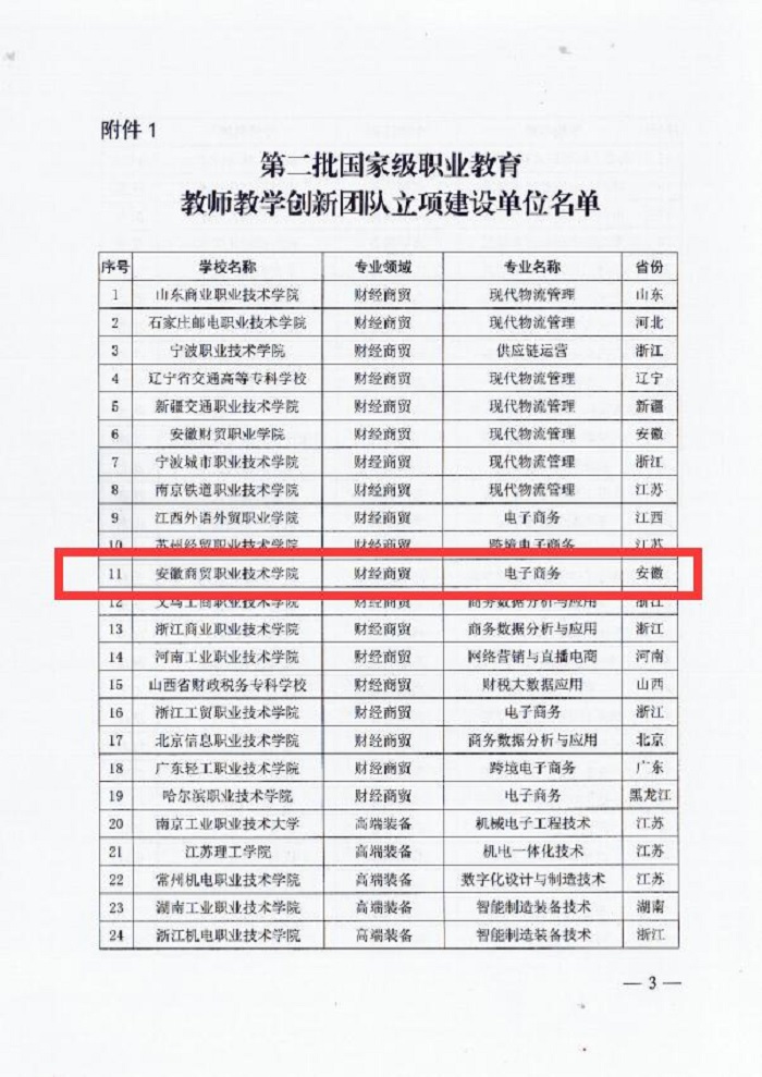 近日,教育部公布了“第二批国家级职业教育教师教学创新团队立项建设单位和培育建设单位名单”,我校电子商务教学创新团队成功入选立项建设 雷火竞技,此次共确定国家级职业教育教师教学创新团队立项建设单位240个。