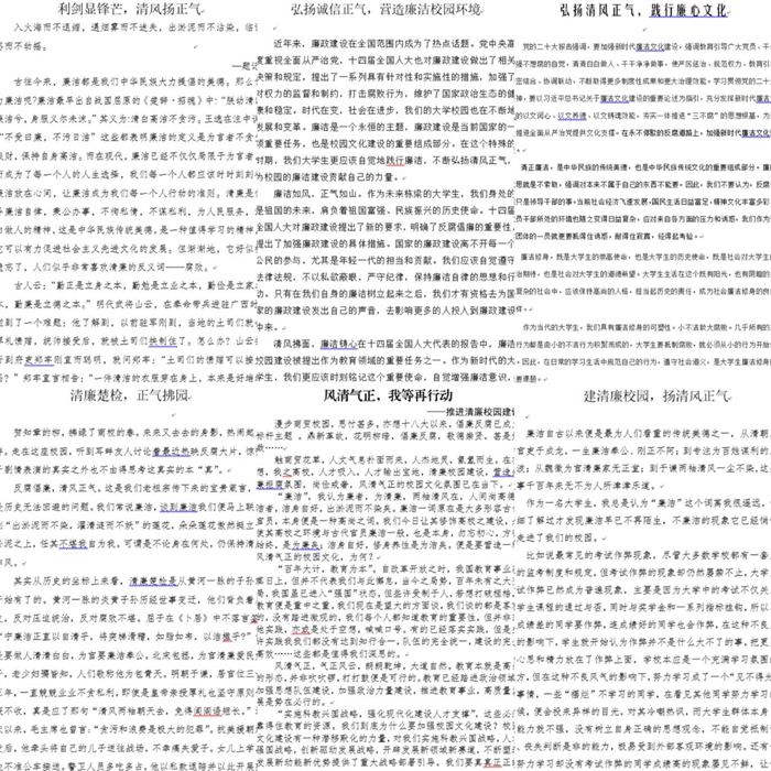 翰墨树正气,妙笔扬清风,国际商务与旅游学院开展了“廉心文语”校园征文活动,号召全院师生以文字为媒介,结合思想,学习和工作生活实际,撰写随笔,信件,读后感等形式多样的文章,同学们将自己对廉洁的理解尽情用文字诠释,《利剑显锋芒 雷火竞技官网,清风扬正气》《人生当如茶,清廉胜浮华》《行清廉之举,扬清风正气》《兰在幽林亦自香》《以廉为镜正己身,以勤为舟传美德》……大家将廉洁文化从笔尖耕植于心,从心尖显现于行,文章中蕴含了中华优秀传统文化,红色革命文化,社会主义先进文化和优良家风等廉洁文化元素,本次廉洁征文活动共收到参赛作品18份,经过6名评委老师们认真评分,最终评选出一等奖2名,二等奖3名,三等奖5名,优秀奖若干。
