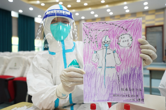江苏省南京市翠屏山小学检测点,来自江南大学附属医院的医生曹亚船在工作间隙展示一名小朋友赠送的绘画作品 雷火竞技app下载,新华社记者 季春鹏 摄。