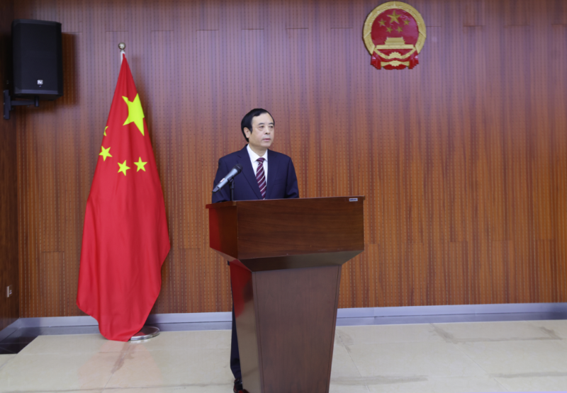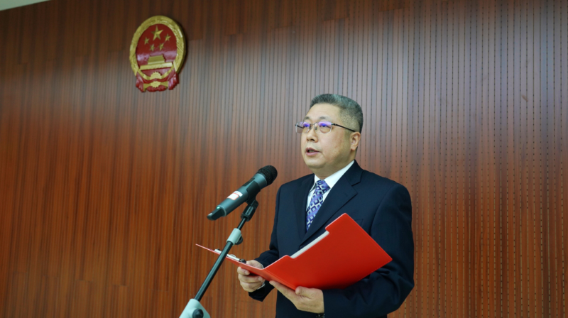 仪式现场气氛庄严,国徽高悬 雷火竞技app下载,国旗鲜艳,上午9时,参加人员全体肃立,奏唱中华人民共和国国歌,领誓人厅一级巡视员贾宝明左手抚按宪法,右手举拳,领诵誓词,其他宣誓人列队站立,跟诵誓词。