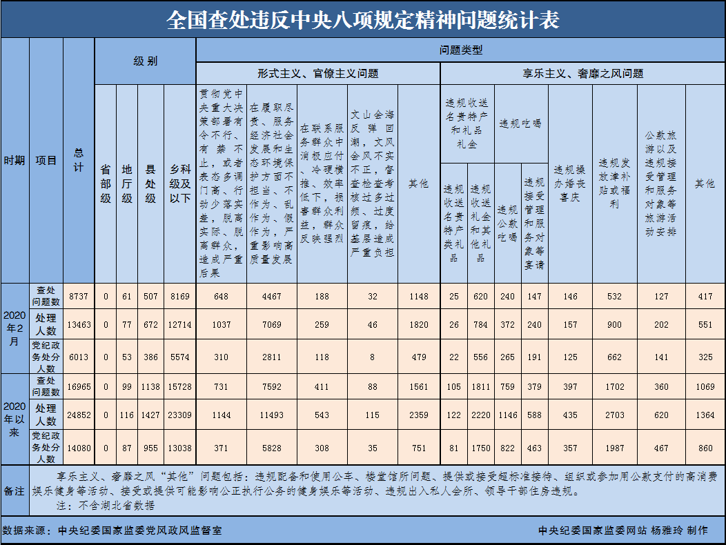 为掌握全国贯彻落实中央八项规定精神情况,中央纪委国家监委在各省区市和新疆生产建设兵团,各中央和国家机关,各中央企业和中央金融企业等建立了落实中央八项规定精神情况月报制度,2020年以来 雷火竞技,截至2月29日,全国查处违反中央八项规定精神问题情况如下:。