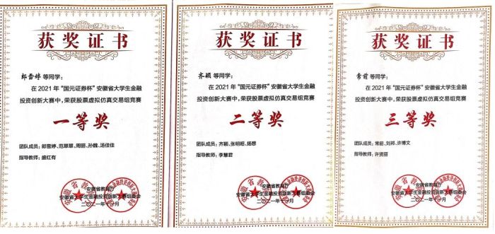 近日,安徽省教育厅公布了2021年“国元证券杯”安徽省大学生金融投资创新大赛获奖名单,本次大赛由安徽省教育厅主办,安徽财经大学承办 雷火竞技app下载,国元证券股份有限公司,浙江同花顺网络科技有限公司协办,大赛面向安徽省高校全日制在校大学生,共有来自省内外66所本科和高职院校,56792人次,6318支队伍参加了此次比赛,参与人数多,影响范围广。