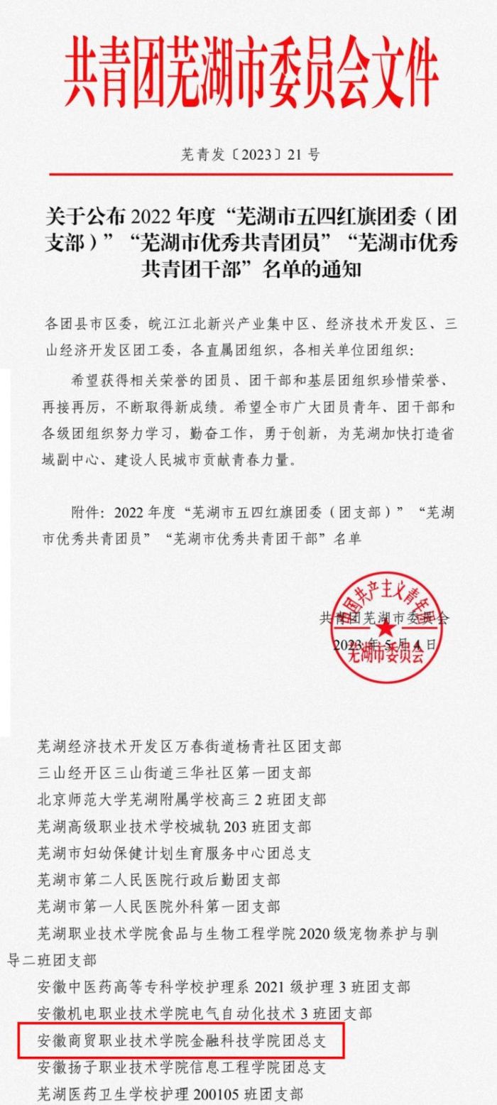 5月4日,正值青年节当天,共青团芜湖市委员会公布2022年度“芜湖市五四红旗团委(团支部)”“芜湖市优秀共青团员”“芜湖市优秀共青团干部”名单的通知中 雷火竞技app下载,金融科技学院团总支荣获2022年度“芜湖市五四红旗团总支”称号。