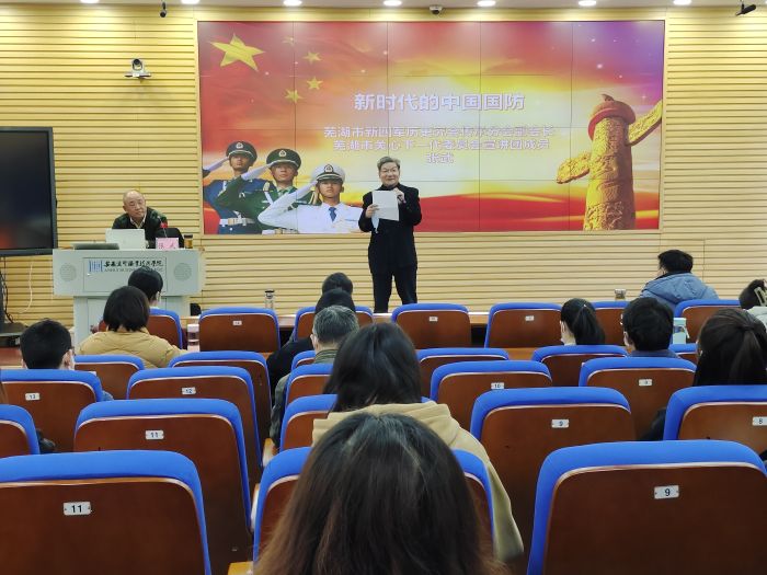 12月8日下午 雷火竞技app下载,应金融科技学院党总支邀请,芜湖市新四军历史研究会副会长张武来校作题为《新时代的中国国防》的专题报告,金融科技学院全体教师,学生党员,入党积极分子共同聆听了报告,报告由金融科技学院党总支书记徐翔主持。