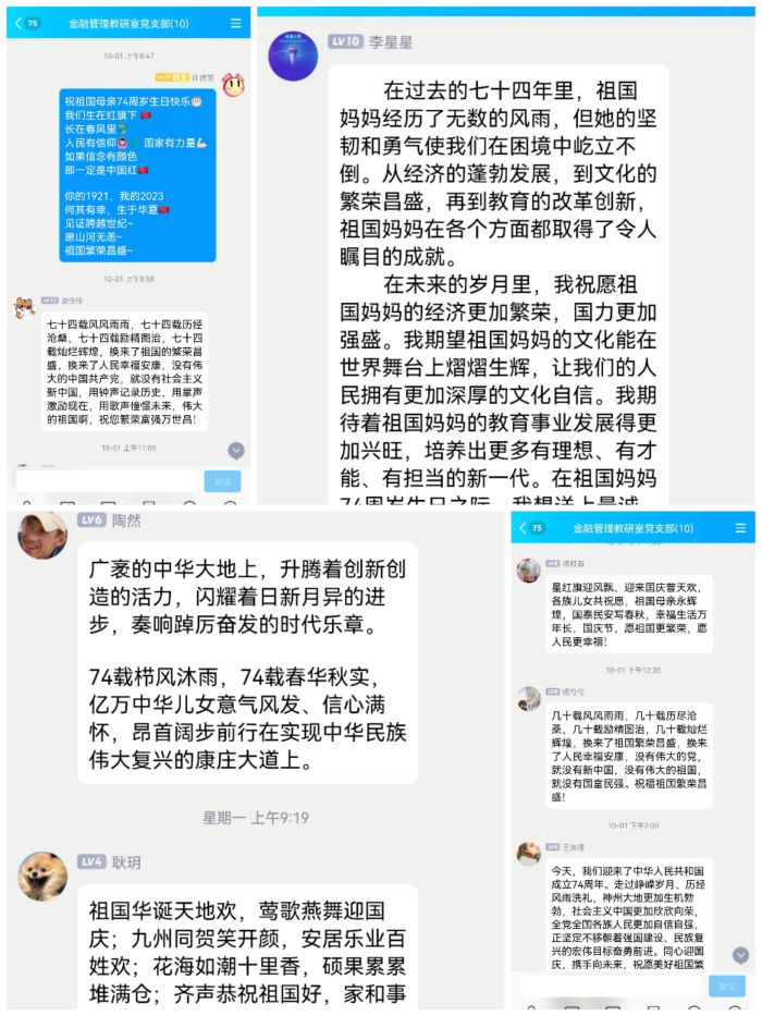 为庆祝中华人民共和国成立74周年,进一步弘扬以爱国主义为核心的民族精神和以改革创新为核心的时代精神,推进学习贯彻习近平新时代中国特色社会主义思想主题教育走深走实 雷火竞技app下载,增强党组织和党员教师不忘初心,实干担当,奋发有为的自觉性,主动性和创造性,金融管理教研室党支部组织开展“重温红色记忆 赓续革命精神 凝聚奋进力量 我为祖国妈妈送祝福”系列主题党日活动。