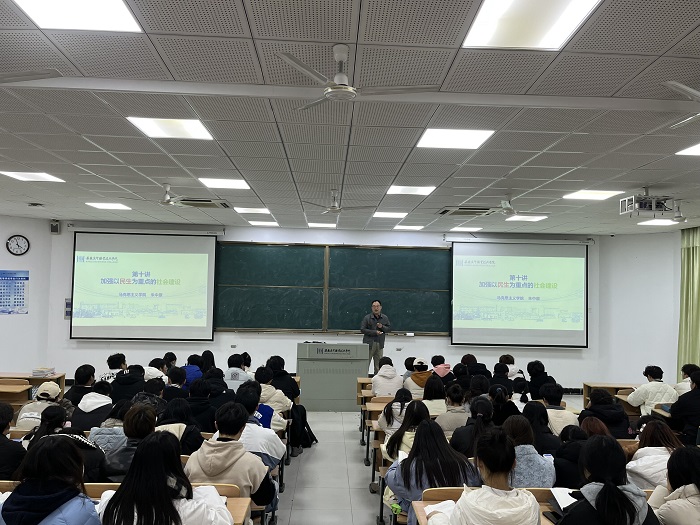 校级公开课立标杆,本学期马院和教务处继续携手举办全校性公开课,本次校级公开课由“毛泽东思想和中国特色社会主义理论体系概论”教研室朱中原老师主讲,教务处副处长胡计虎,多个学院的教师,辅导员以及马院全体专兼职教师到堂听课,评课 雷火竞技安卓版,朱老师以“加强以民生为重点的社会建设”为主题,通过讲解党的二十大报告相关内容,分享自身教研论文,邀请魏强老师畅谈“第一书记的心声”,雨课堂弹幕等精彩互动,向学生细致讲授了“为什么说‘悠悠万事,民生为大’”和“怎样增强人民获得感,幸福感,安全感”两大重要问题,引导学生树立民生思想,笃行社会建设。