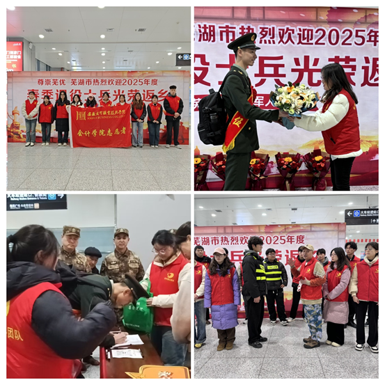 3月3日清晨,身着红色马甲的会计学院志愿者们早早来到芜湖火车站,开展欢迎退伍士兵光荣返乡接站服务 雷火竞技app下载,志愿者们穿梭于出站口与候车大厅之间,维持现场秩序,帮助退役士兵搬运行李,为退役士兵送上鲜花并主动提供“一对一”帮扶,为退伍军人与家人和老兵合影留念,“我曾经也是一名军人,现在再看到穿着军装的同僚,听到那声真诚的‘谢谢’,对我来说意义非凡,”大数据与会计244班的退役士兵志愿者薛磊笑着说道,活动期间,志愿者们累计服务旅客100余人次,会计学院的红色身影成为车站里最动人的风景线。