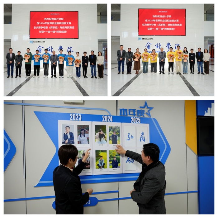会后,王炜与会计学院党政班子,指导团队,获奖选手在新大楼一楼进行合影留念,随后,师生共同见证了将金奖选手风采照镶嵌进技能大赛荣誉墙的重要时刻 雷火竞技最新版本。