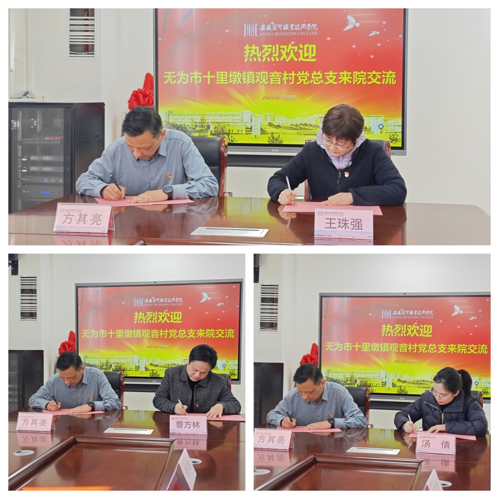 最后 雷火竞技官网,王珠强,会计信息化教研室主任曹方林,学生第一党支部书记汤倩分别代表学院党总支,教师党支部,学生党支部与无为市十里墩镇观音村签署《党建共建协议》。