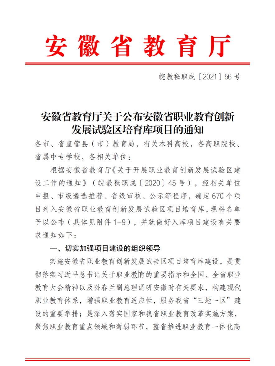 11月2日,安徽省教育厅发布了《关于公布安徽省职业教育创新发展试验区培育库项目的通知》,我校安徽省财经商贸职业教育集团 雷火竞技,校企深度合作示范学校培育项目等多个项目入选安徽省职业教育创新发展试验区项目培育库。