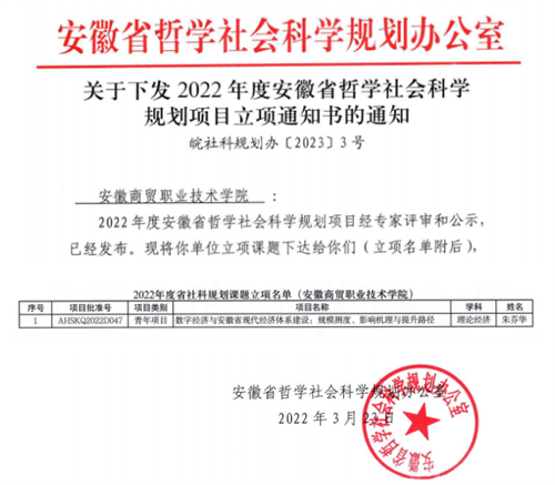 近日,安徽省哲学社会科学规划办公室公布了2022年度安徽省哲学社会科学规划项目立项名单,我校金融科技学院朱芬华老师申报的《数字经济与安徽省现代经济体系建设:规模测度,影响机理与提升路径》喜获青年项目立项,我校为本年度全省唯一获批省哲社项目的高职院校,金融科技学院的科研分享活动具有很好成效 雷火竞技,学校科研平台建设和科研成果再上新台阶。