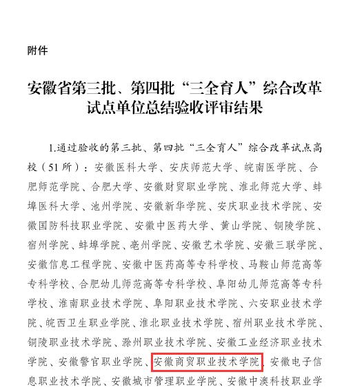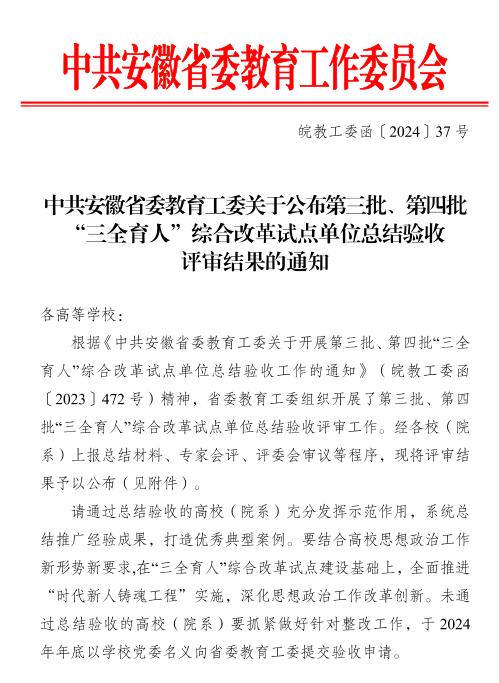 近日,省委教育工委发布《中共安徽省委教育工委关于公布第三批,第四批“三全育人”综合改革试点单位总结验收评审结果的通知》,我校作为安徽省第四批“三全育人”综合改革试点高校,电子商务学院 雷火竞技,国旅商务与旅游学院作为第四批试点院系,均顺利通过总结验收。