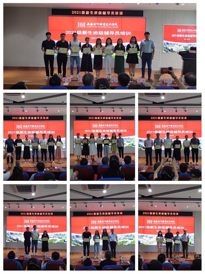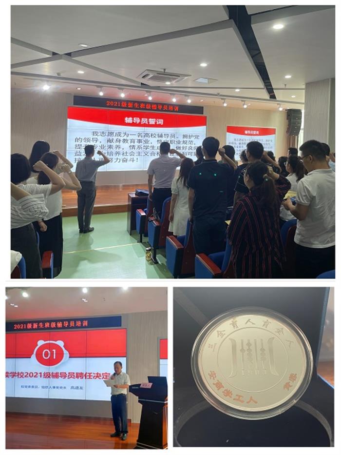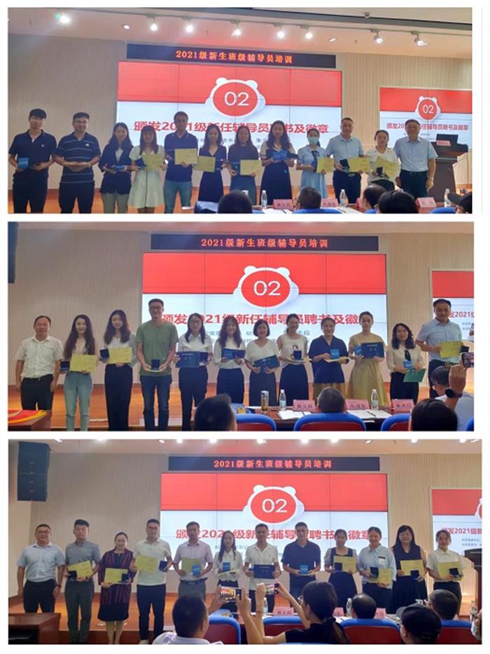 此次培训将仪式教育纳入培训各环节,通过各种仪式环节的设计让辅导员清晰工作思路,明确育人职责,培训共分为入岗仪式,专题讲座,经验交流和院本培训四个部分,内容涵盖职业使命,育人理念,日常管理制度,安全教育,心理健康教育 雷火竞技app下载,资助工作,团学工作,辅导员经验分享,信息化系统培训等方面,在入岗仪式上,校党委委员,组织人事处处长高道友宣读了学校2021级新生班级辅导员聘任决定,并与校党委副书记,纪委书记朱光应,教务处处长黄义兵一同为33名专兼职辅导员颁发了聘任证书和“安商学工人”徽章,随后,全体辅导员庄严宣誓“我志愿成为一名高校辅导员,拥护党的领导,献身教育事业……”,谆谆誓言响彻会场。