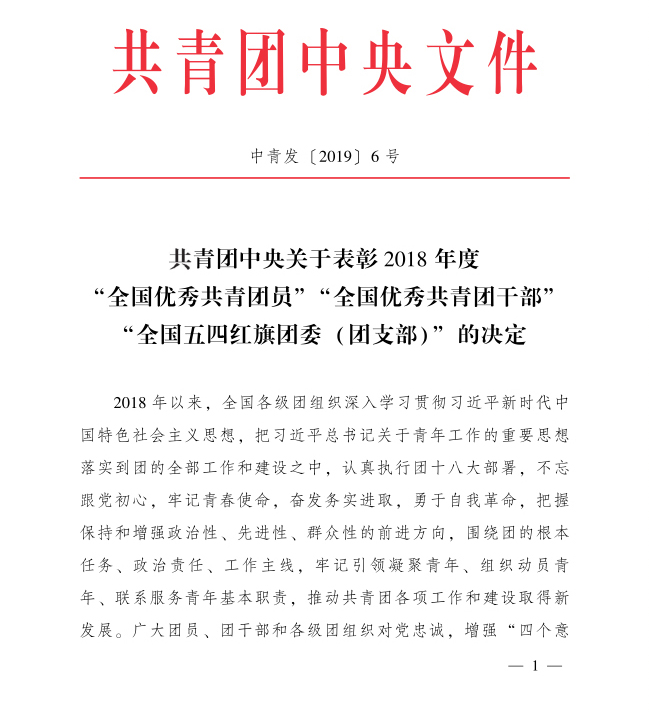 五四运动100周年来临之际,我校团委和广大青年收到了一份节日大礼 雷火竞技,共青团中央发布关于2018年度“全国优秀共青团员”“全国优秀共青团干部”“全国五四红旗团委(团支部)”的表彰决定,其中共授予全国500个基层团组织“全国五四红旗团委(团支部)”称号,我校喜获此项荣誉,“全国五四红旗团委(团支部)”称号是共青团中央授予基层团组织的最高荣誉,我校也是首次获此殊荣。