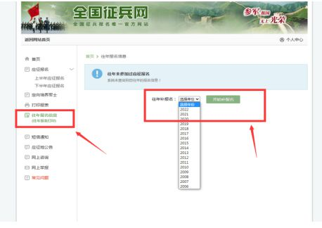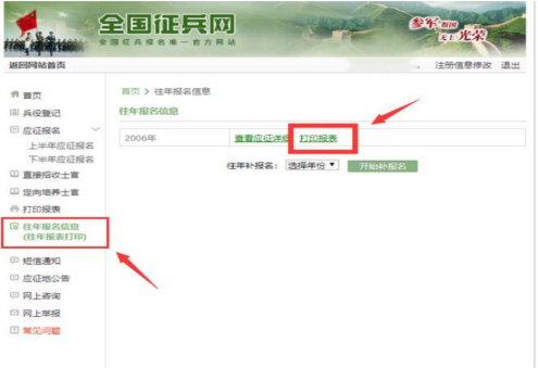 2.4在左侧菜单中,点击“往年报名信息(往年报表打印)”选择对应的补报年份进行补报