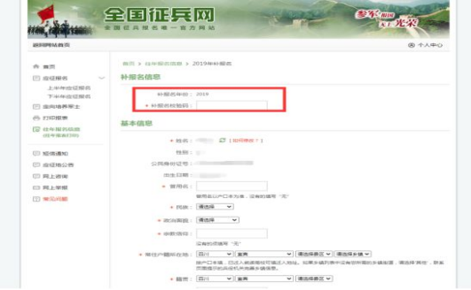 2.5 填写“补报名校验码”,根据自己实际情况填写“基本信息”“学业信息”“家庭信息”及“参军信息”,上传“近期一寸免冠照片”,信息填写参考如下;检查无误后点击“确定”。