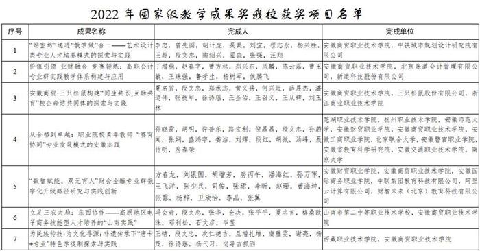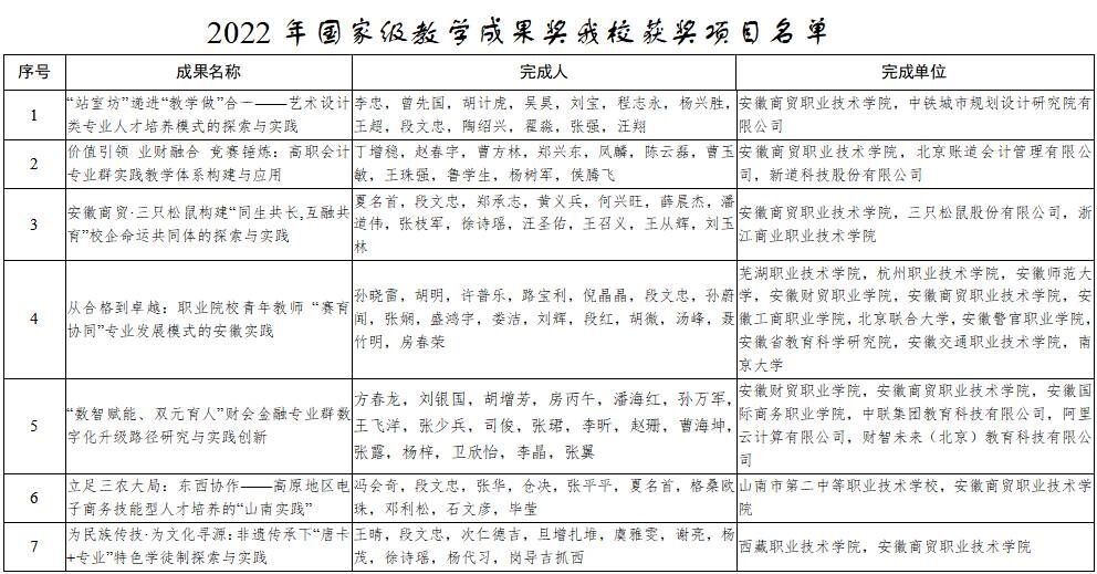 我校党委副书记,院长李忠主持的《“站室坊”递进“教学做”合一——艺术设计类专业雷火竞技安卓版模式的探索与实践》,形成了递进式“教学做合一”雷火竞技安卓版模式,会计学院院长丁增稳主持的《价值引领 业财融合 竞赛锤炼:高职会计专业群实践教学体系构建与应用》,构建了高职会计专业群“五步法”实践教学体系 雷火竞技app下载,电子商务学院院长夏名首主持的《安徽商贸·三只松鼠构建“同生共长,互融共育”校企命运共同体的探索与实践》,探索了校企协同共生,共长,共赢的校企命运共同体,我校参与的《从合格到卓越:职业院校青年教师“赛育协同”专业发展模式的安徽实践》《“数智赋能,双元育人”财会金融专业群数字化升级路径研究与实践创新》《立足三农大局:东西协作——高原地区电子商务技能型雷火竞技安卓版的“山南实践”》《为民族传技·为文化寻源:非遗传承下“唐卡+专业”特色学徒制探索与实践》等项目分别凝练了我校在教师培养,专业群建设,雷火竞技安卓版模式等方面的实践探索与成果。