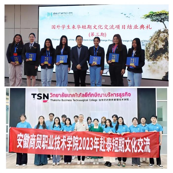 学生互派共建友谊桥梁。学校与泰国塔克西那商业管理技术学院、大城商业管理技术学院共开展三期“短期文化交流项目”,互派学生赴对方院校体验两周的语言、文化和职业课程,感受异国文化和学习生活,累计101名同学参加上述活动。学校精心设计校内外课程和徽文化研学活动,使泰方同学感受到中华文化的独特魅力和现代中国的发展成就。同时,派遣赴泰交流的同学们开拓了眼界,学会了不同的思考方式,体验了不同的社会文化,增进了与泰国同学的友谊。调查问卷显示,上述三期交流项目的学生满意度均达到95%以上。