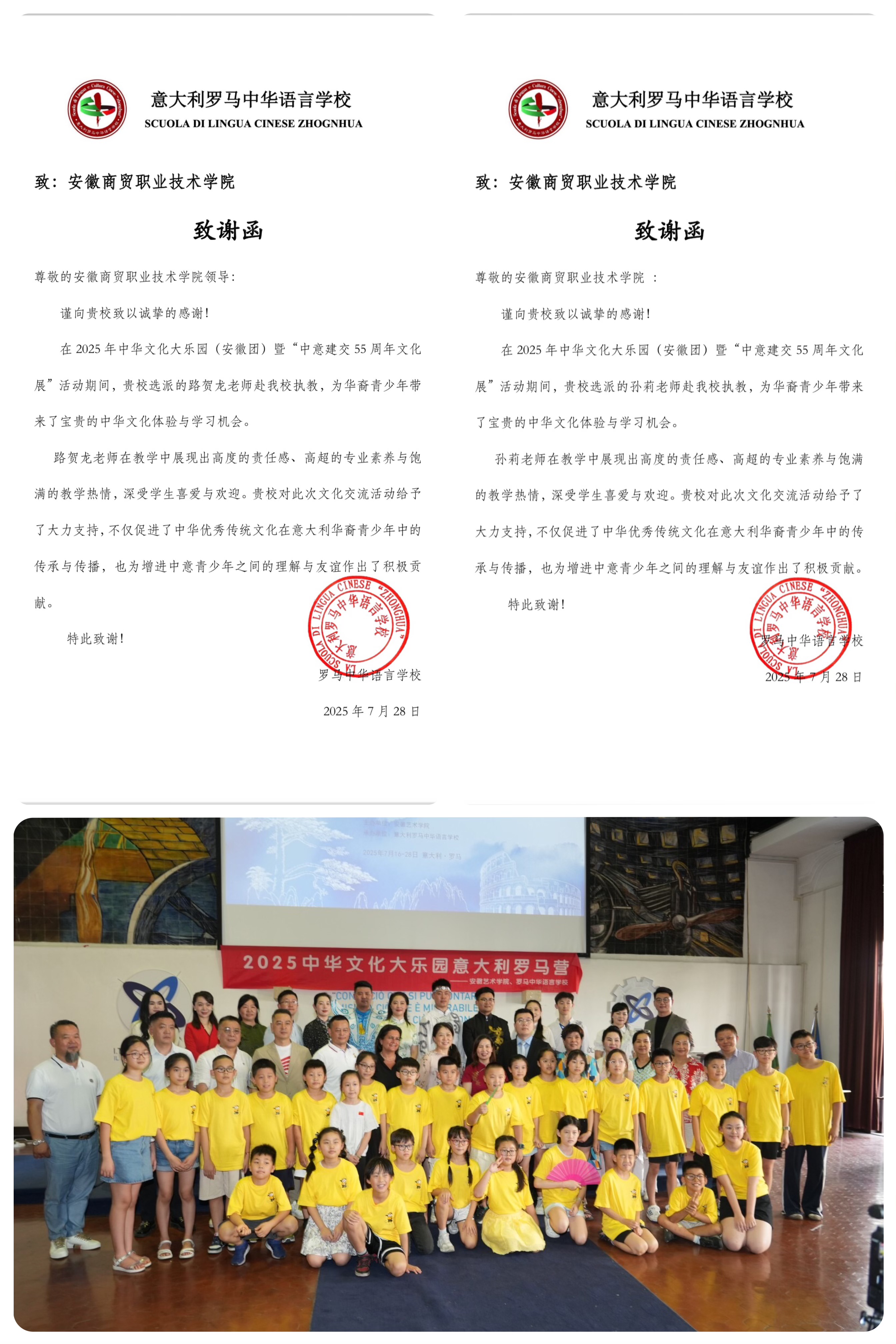7月16日至28日,由安徽省委统战部主办的“2025年中华文化大乐园——罗马营”在意大利罗马中华语言学校举办,学校孙莉和路贺龙两位教师凭借出色表现,为传播中华文化贡献了力量,赢得广泛赞誉,为此,意大利罗马中华语言学校向我校发来致谢函 雷火竞技。