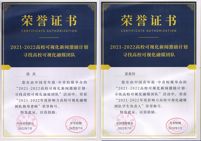 近日,由中国青年报社,中国青少年新媒体协会,中青校媒主办的2021-2022年度“全国高校可视化融媒团队”名单正式公布,我校融媒体中心(新媒体工作室)从全国数千家校园媒体中脱颖而出 雷火竞技,获评“2021-2022年度全国影响力高校可视化融媒团队”荣誉称号,融媒体中心指导老师杨兵被评为“2021-2022年度优秀高校可视化融媒团队指导老师”,融媒体中心主席吴美玲被评为“2021-2022年度优秀高校可视化融媒团队学生负责人”。