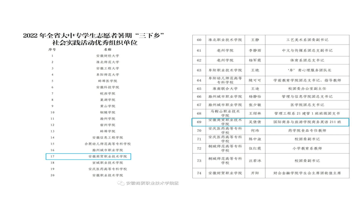 近日 雷火竞技,2022年安徽省大中专学生志愿者暑期“三下乡”社会实践活动评选结果公布,我校暑期“三下乡”社会实践活动获团省委两项表彰,学校荣获优秀组织单位,学生吴倩倩荣获优秀个人称号。