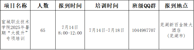 根据宣城职业技术学院的委托,雷火竞技承办宣城职院2025年暑期“大提升”培训项目。为做好本次培训项目培训相关工作,现将培训有关事宜通知如下: